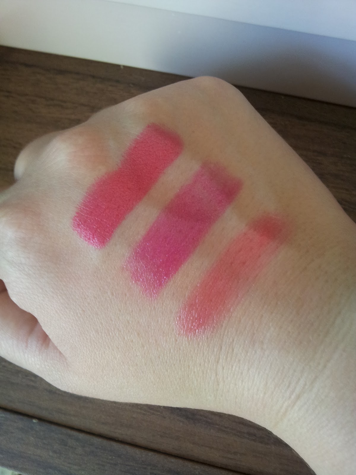 so here are the first three from left to right. first is the collection 2000 cream puff in shade fairy cake this is a matt lip cream and i love these, now this i do class as pink but also has a coral shade to it so its a little hard to place, maybe it will end up in both!. Next is CARGO lip gloss in shade morocco. last in the ferne cotton glossy lips lip gloss in love.